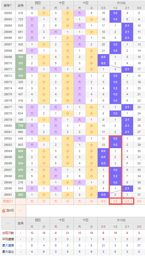 上期大小比:0:3,近10期大小比出现情况:1:2、1:2、0:3、0:3、0:3、1:2、1:2、1:2、2:1、0:3,最近10期出1期2:1,出现5期1:2,出现4期0:3,出现0期3:0,根据近10期出号规律本期推荐隔期出2:1,防遗漏2期出2:1,综上所述大小比推荐:2:1,重点关注:1:2。