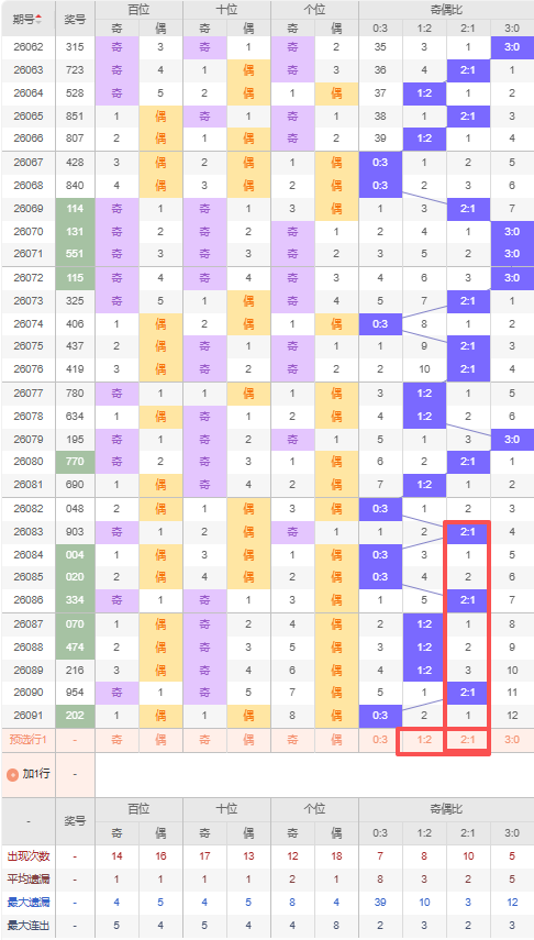 上期奇偶比:0:3,近10期奇偶比出现情况:0:3、2:1、0:3、0:3、2:1、1:2、1:2、1:2、2:1、0:3,最近10期出现3期2:1,出现3期1:2,出现4期0:3,出现0期3:0,根据近10期出号规律本期推荐隔期出2:1,防遗漏2期出1:2,综上所述奇偶比推荐:1:2,重点关注:2:1。