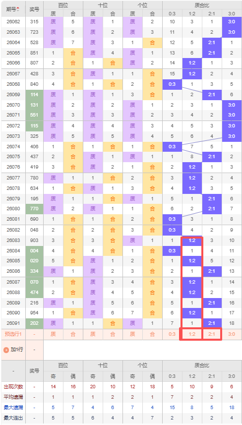 上期质合比:2:1,近10期质合比出现情况:0:3、1:2、0:3、1:2、2:1、1:2、1:2、2:1、1:2、2:1,最近10期出现3期2:1,出现5期1:2,出现2期0:3,出现0期3:0,根据近10期规律本期推荐连出的2:1,防隔期出1:2,综上所述质合比推荐:1:2,重点关注:2:1。