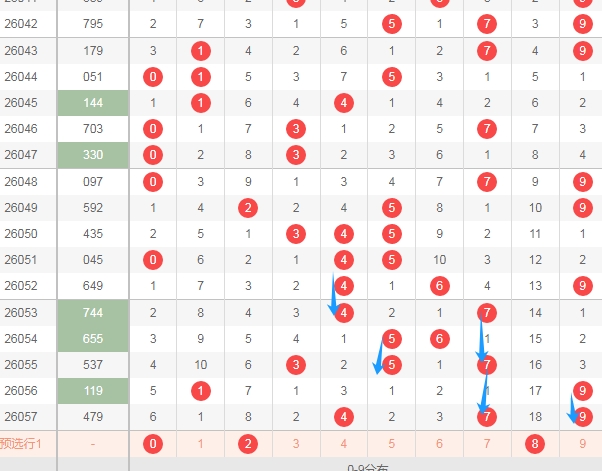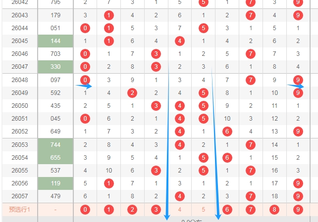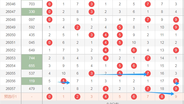 上图是体彩排列三开奖号码走势分布图,我在上面走势图中标注出来的数字是目前来说遗漏周期大的数字028,其中数字8遗漏了18期,为什么要关注这些遗漏周期大的数字呢?看上面标注出来的蓝色小箭头,最近开出的数字遗漏周期都是小的周期,上期数字9遗漏周期是0因为是重复号码,数字7是隔一期的数字,所以本期开遗漏周期大的数字还是有机会的。