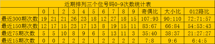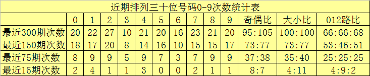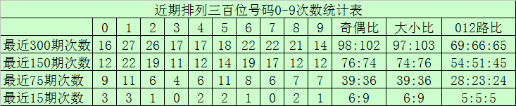 百位分析:最近300期奖号由冷到热表现为:021,427,5928,329,6830,234,735,138次,奖号奇偶比为158:142,大小比为151149012路比为108:100:92