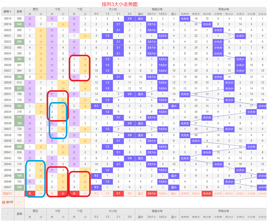 上一期大小比为0:3,全小的号码组合,近五期大号出4次,小号出11次,大号码出现较少,上一期是两小的号码组合,本期侧重两大的号码组合,百位侧重大号码,十位侧重小号码,个位侧重大号码,侧重大小大或者大大小的号码组合,根据大小形态五码定位56789/01234/56789或者56789/56789/01234