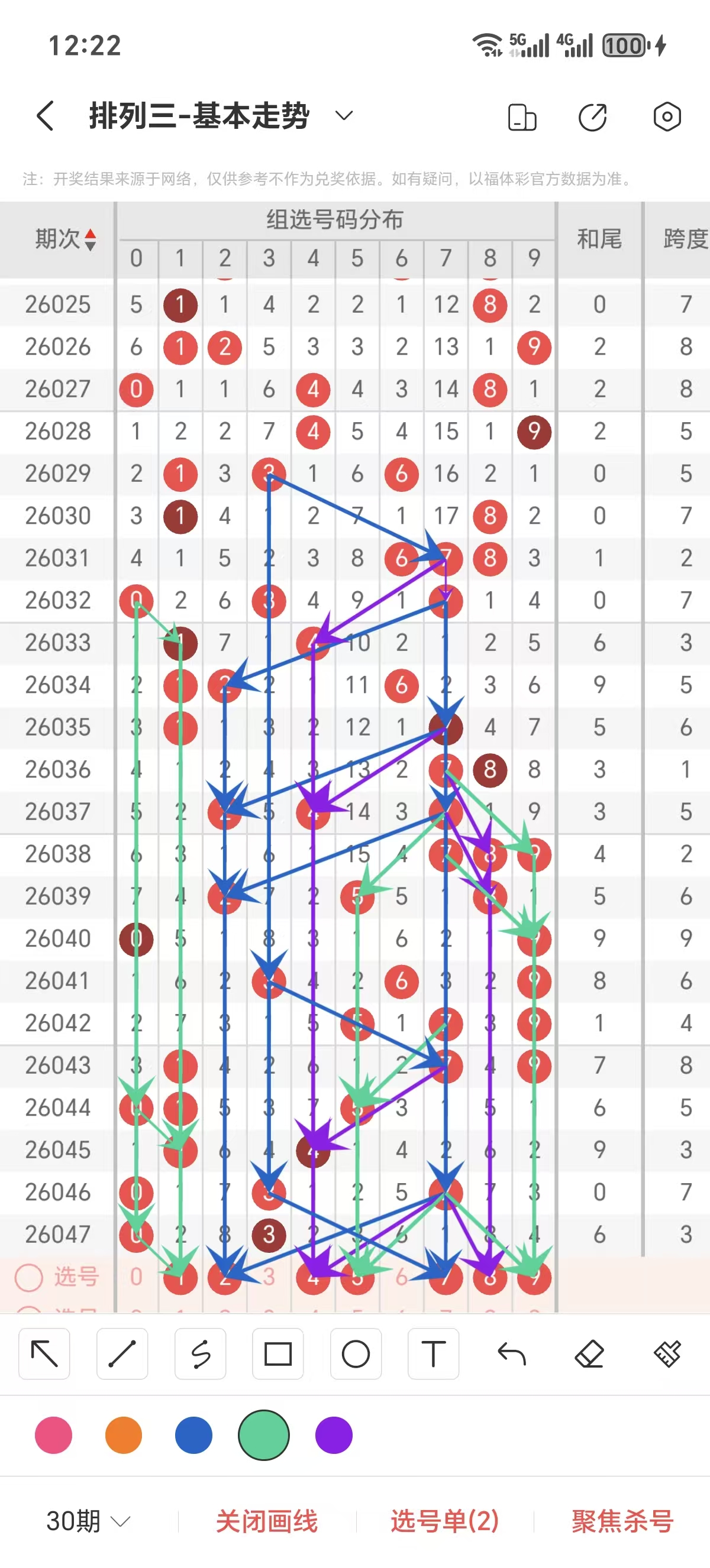 通常情况下在五期之内重复一个跨度的概率较高,近五期重复了3的跨度,近五期跨度为8/5/3/7/3,近期02路的跨度较热,本期要侧重5/6/7跨为主的号码组合。选择好跨度就可以从跨度方面选择相应的双胆码组合,双胆码的选取要根据近期和历史的走势进一步的分析选取。