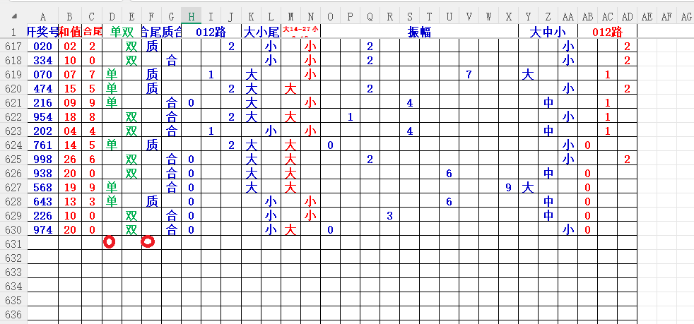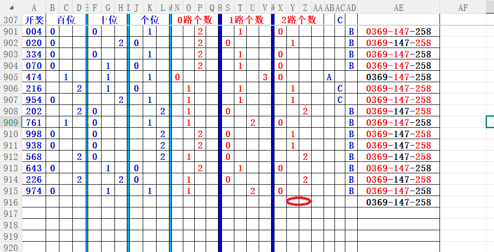 如上图56,012路分析0路出号的概率还是很大,本期可以0路号入手做胆0369中选;看好369胆码