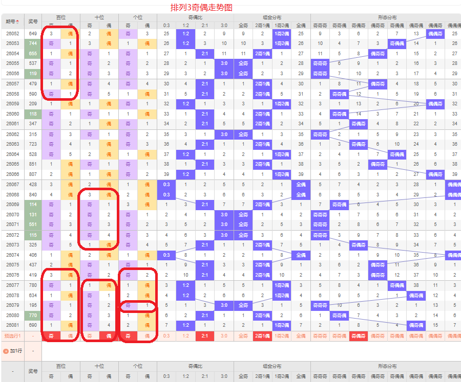 上一期的奇偶比为1:2,两偶的号码组合,从近五期的奇偶数出现情况看,奇数出8次,偶数出现7次,奇数偶数号码出现较平均,本期要侧重两奇的号码组合,侧重奇偶奇或奇偶偶的号码组合,根据奇偶组合形态可做五码定位13579/02468/13579或13579/02468/02468