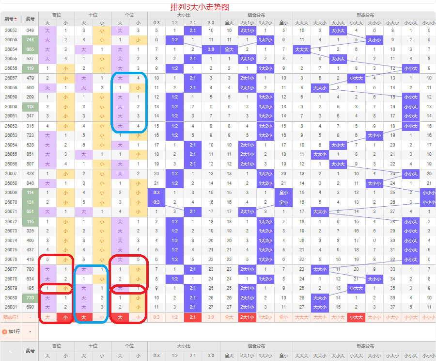 上一期大小比为2:1,两大的号码组合,近五期大号出9次,小号出6次,大号码出现较多,上一期是两大的号码组合,本期侧重两大的号码组合,百位侧重小号码,十位侧重大号码,个位侧重大号码,侧重小大大或者小大小的号码组合,根据大小形态五码定位01234/56789/56789或者01234/56789/01234