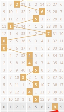 上图是体彩排列三开奖号码和值尾数走势分布图,我标注出来的数字是和值8尾数已经连续遗漏了40期,那么本期或者近期大家要留意留意和值8尾数。