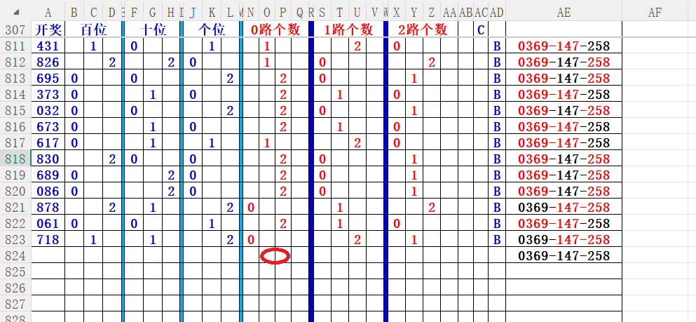 如上图56,012路分析0路出号的概率还是很大,本期可以0路号入手做胆0369中选;看好369胆码