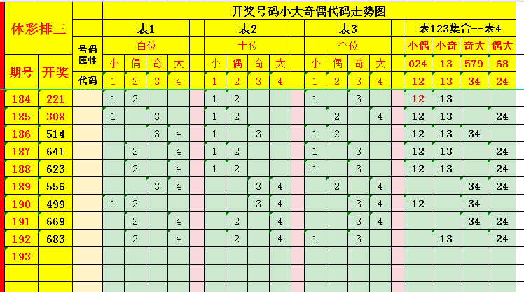 (一)用开奖号码构建一个“小大奇偶”代码转换体系。 首先把0123456789十个开奖数字,按照数字的“小大奇偶”属性,设定与1234相对应的代码即:小数01234代码为“1”;偶数02468的代码为“2”;奇数13579的代码为“3”,大数56789的代码为“4”;根据以上规则,并依据开奖号码分别搭建出百位、十位、个位的“小大奇偶”代码走势图,分别见表1表2表3表4,具体表述如下: