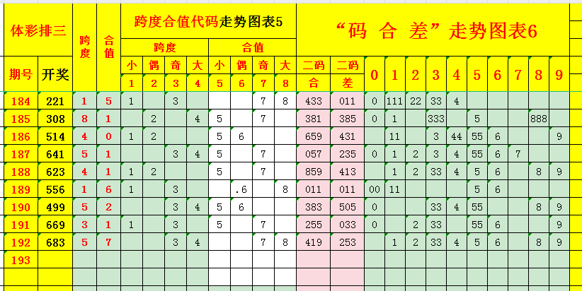 另外,根据开奖号码、二码合、二码差的数字特征,构建一个的综合走势图见表6;