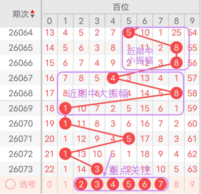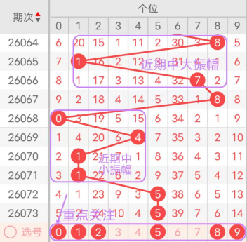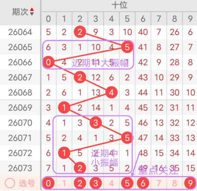 7期(067~073)开奖号十位号码球分别为2、4、1、3、5、1、2,开奖号与上一期走出的振幅分别为2、2、3、2、2、4、1。067期走出2号小数号码球,走出“2”的小幅度,068期走出4号中小数号码球,走出“2”的小幅度,069期走出1号小数号码球,走出“3”的中小幅度,070期走出3号中小数号码球,走出“2”的小幅度,071期走出5号中大数号码球,走出“2”的小幅度,072期走出1号小数号码球,走出“4”的中小幅度,073期走出2号小数号码球,走出“1”的小幅度;从振幅大小及走势图的整体对应来看,中大振幅走在4~7之间较为适宜,中小振幅走在0~3之间较为适宜;结合走势图的上下对应及振幅大小分析,本期十位应重点关注号码球为0、23、5、6、9。