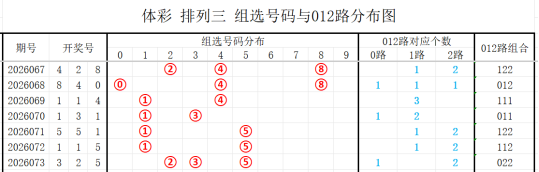 7期(067~073)开奖号与012路组合分别为428(122)、840(012)、114(111)、131(011)、551(122)、115(112)、325(022)上期开奖号为022路组合,根据整体走势分析,本期看好的012路组合有:012、002、011,022、222、001路组合。