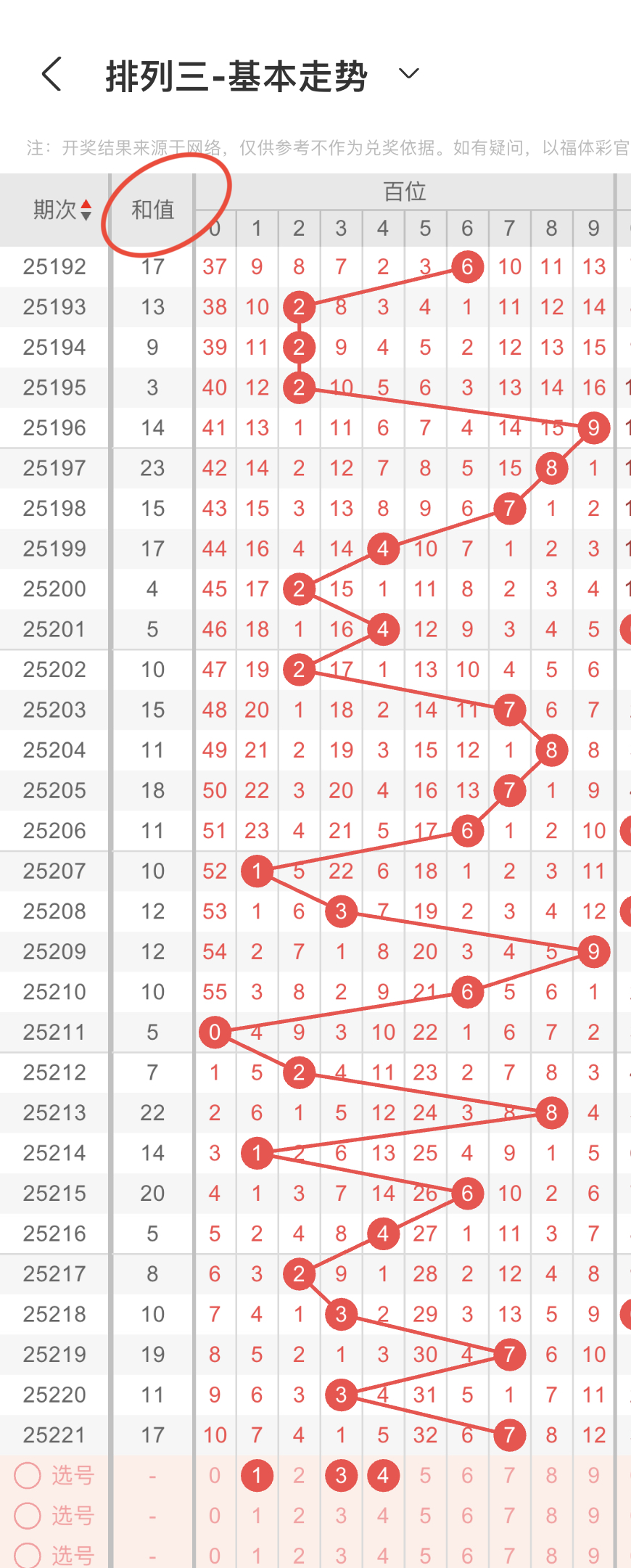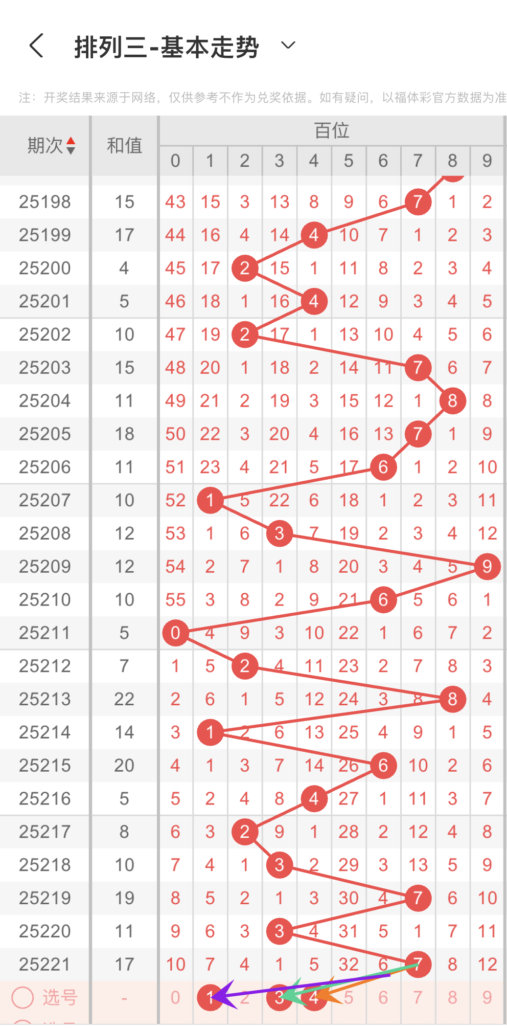 结合上面的大小、奇偶以及012路比,我们可以得到的数据分别是第一组01234,第二组13579,第3组147,我们重点选择3组数据中重复的,那百位我们选择1,防0路的3,1路的4,综上所述百位选134