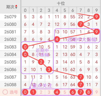 7期(082~088)开奖号十位号码球分别为4、0、0、2、3、7、7,开奖号与上一期走出的振幅分别为5、4、0、2、1、4、0。082期走出4号中小数号码球,走出“5”的中大幅度,083期走出0号小数号码球,走出“4”的中小幅度,084期走出0号小数号码球,走出“0”的小幅度,085期走出2号小数号码球,走出“2”的小幅度,086期走出3号中小数号码球,走出“1”的小幅度,087期走出7号大数号码球,走出“4”的中小幅度,088期走出7号大数号码球,走出“0”的小幅度;从振幅大小及走势图的整体对应来看,中大振幅走在6~7之间较为适宜,中小振幅走在0~3之间较为适宜;结合走势图的上下对应及振幅大小分析,本期十位应重点关注号码球为0、1、46、7、8。
