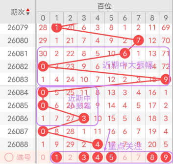 7期(082~088)开奖号百位号码球分别为0、9、0、0、3、0、4,开奖号与上一期走出的振幅分别为6、9、9、0、3、3、4。082期走出0号小数号码球,走出“6”的中大幅度,083期走出9号大数号码球,走出“9”的大幅度,084期走出0号小数号码球,走出“9”的大幅度,085期走出0号小数号码球,走出“0”的小幅度,086期走出3号中小数号码球,走出“3”的中小幅度,087期走出0号小数号码球,走出“3”的中小幅度,088期走出4号中小数号码球,走出“4”的中小幅度;从振幅大小及走势图的整体形势来看,中大幅度走在4~5之间较为适宜,中小幅度走在0~3之间较为适宜;结合走势图的整体及大小走势分析,本期百位需重点关注号码球为1、3、4、5、8、9