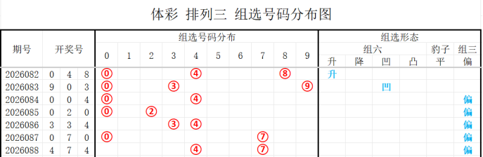 走势图一般要结合最少近7期的出号情况进行综合分析,近7期开奖号分别为:048、903、004、020、334、070、474。组选号码分布如下图: