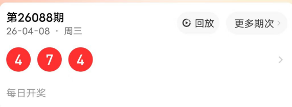 2026088期开奖号码为474,奇偶值为12偶;大小值为12小;012路走势为111路;跨度为3跨;和值15点;组三形态。