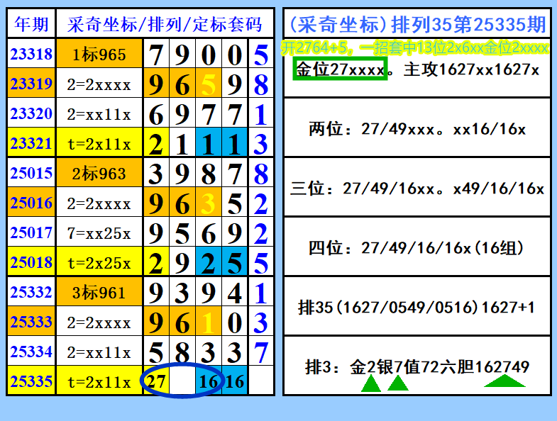 (采奇坐标)视频经典回顾,排列35第335期,一招套中13位2x6xx金位2xx