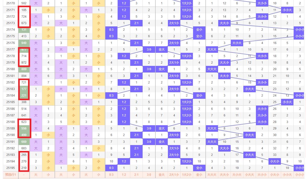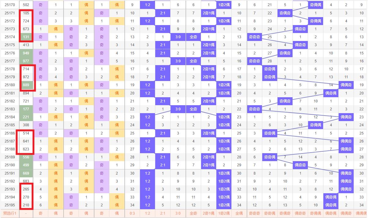 大小走向分析 根据195期开奖号码210,可以看到大小形态为小小小。在最近的走势中,大小号码开出比例基本持平。因此,对于196期,可以预期大小号码继续维持均衡状态,关注大小比1:2的组合。