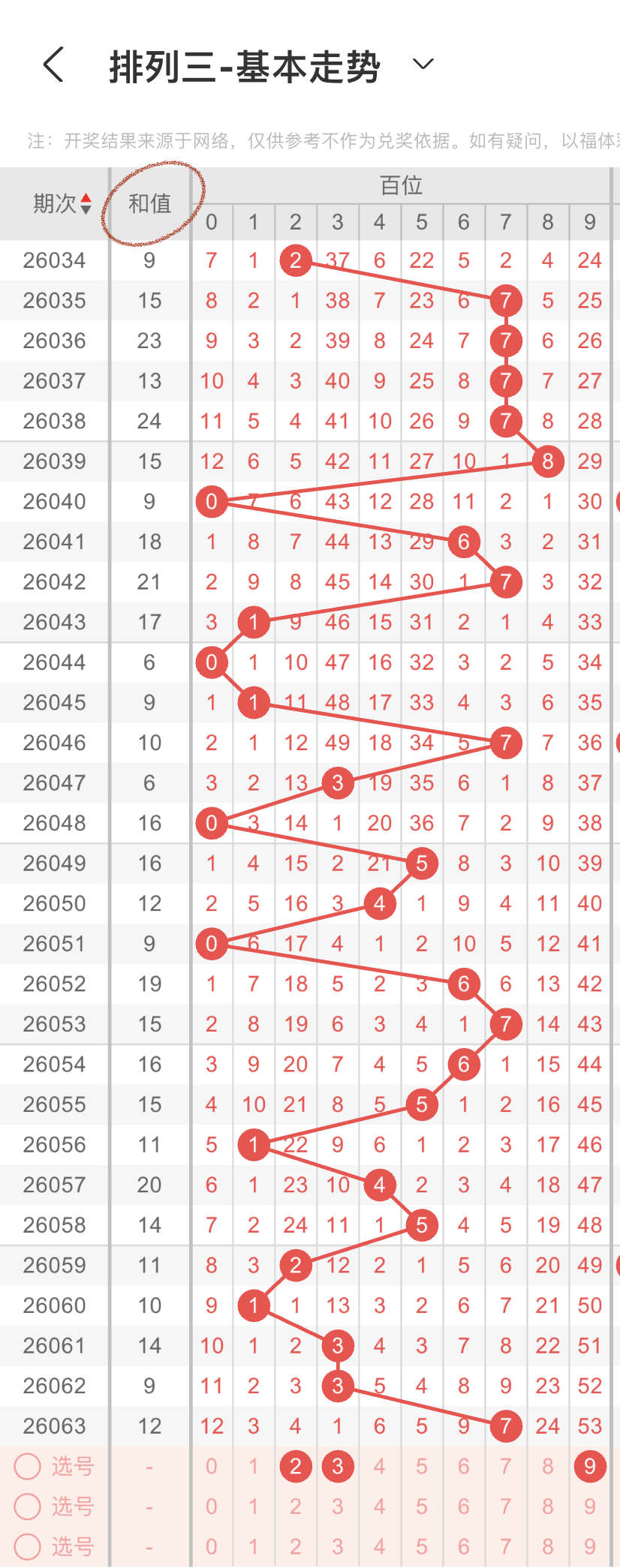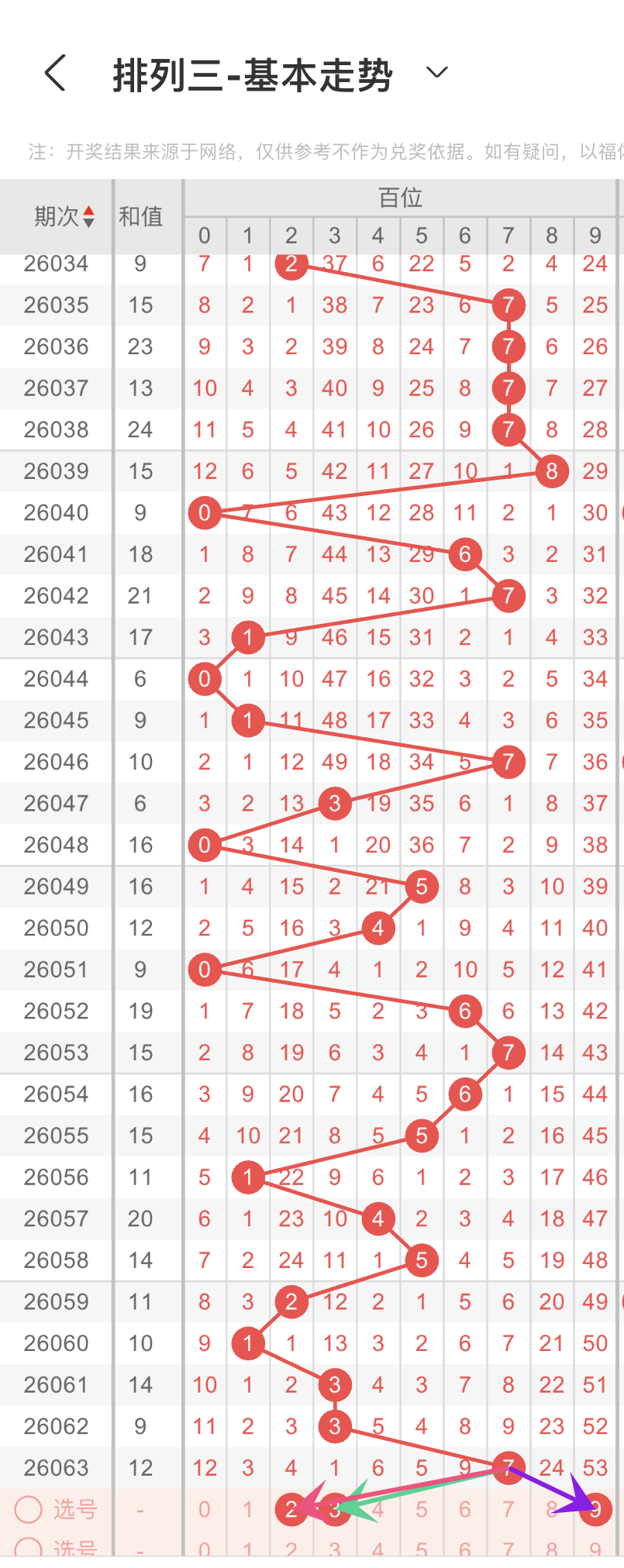 结合上面的大小、奇偶以及012路比,我们可以得到的数据分别是第一组56789,第二组13579,第三组0369,我们重点选择3组数据中重复的,那百位我们选择9,防2路的2,0路的3,综上所述百位选239