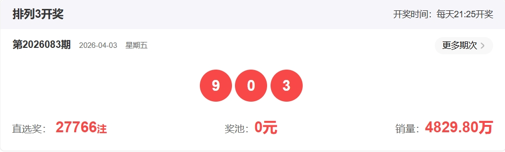 排列三第2026083期开奖回顾:开奖号码:903 形态:组六