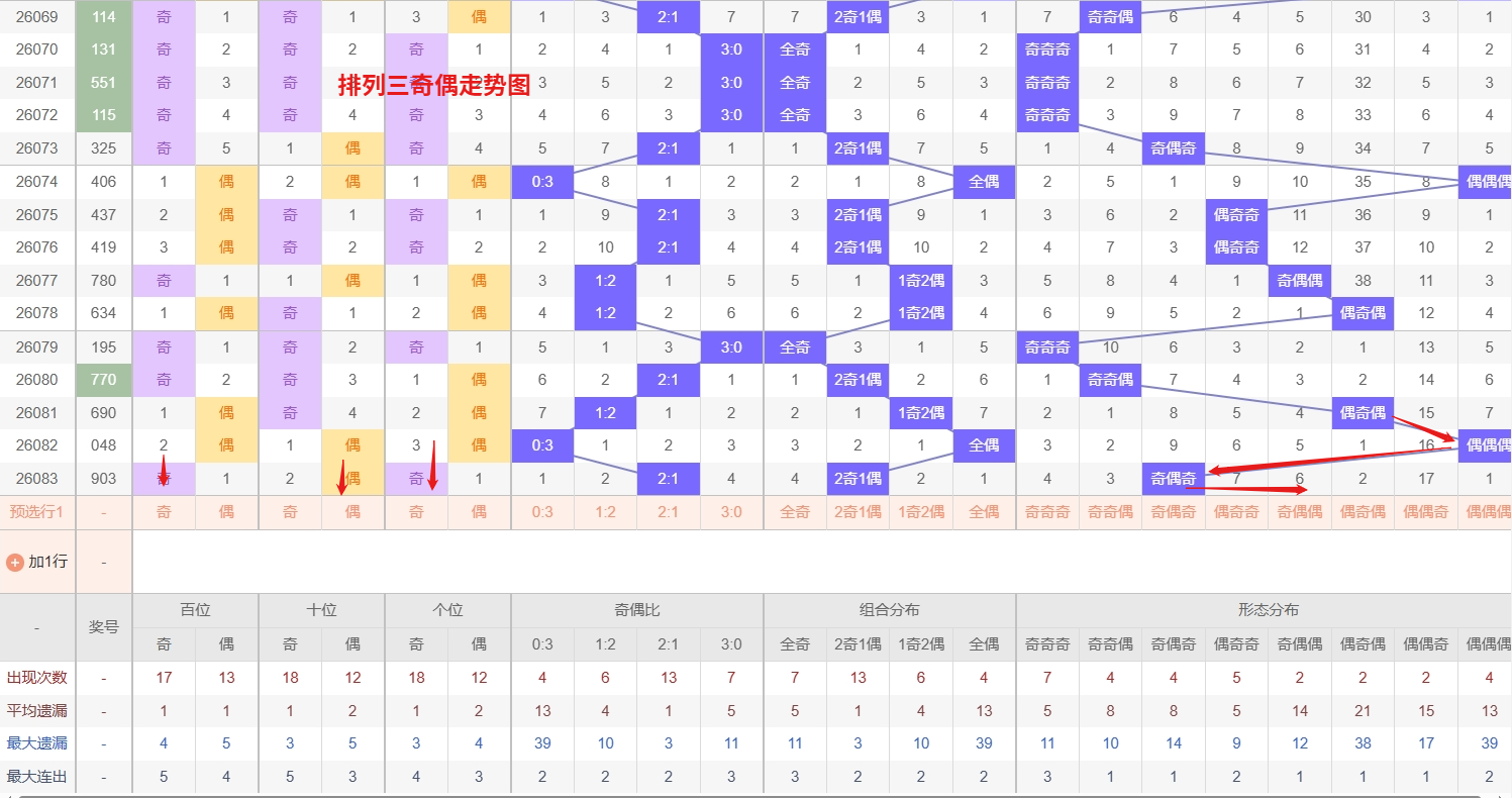 排列三 奇偶分析:从上图可以看出排列三100期内百位奇偶比约为49比51,十位奇偶比为54比46,个位奇偶比为52比48,百位的比值比较均衡,但是十位的比值偏差就有点大,历史奇偶形态近2期开出奇偶奇后下一期的走势为,第005期开出奇偶奇后006期开奇偶偶, 第012期开出奇偶奇后第013期开奇奇奇,第037期开出奇偶奇后第038期开偶偶奇,近期排列三奇偶走势中,奇奇奇作为热号形态表现十分活跃,连续或密集开出的频率较高,说明当前整体节奏偏向全奇组合,热号形态往往具备延续性,短期内仍需防范奇奇奇继续出现的可能。与此同时,奇偶偶则处于明显的冷号状态,已遗漏多期未现身,从形态轮动和冷热平衡的角度看,长时间未出的组合往往存在回补需求,虽然具体时点难以精准判断,但已进入需要重点设防的区间。所以排列三2026084期奇偶形态推奇偶偶与奇奇奇。