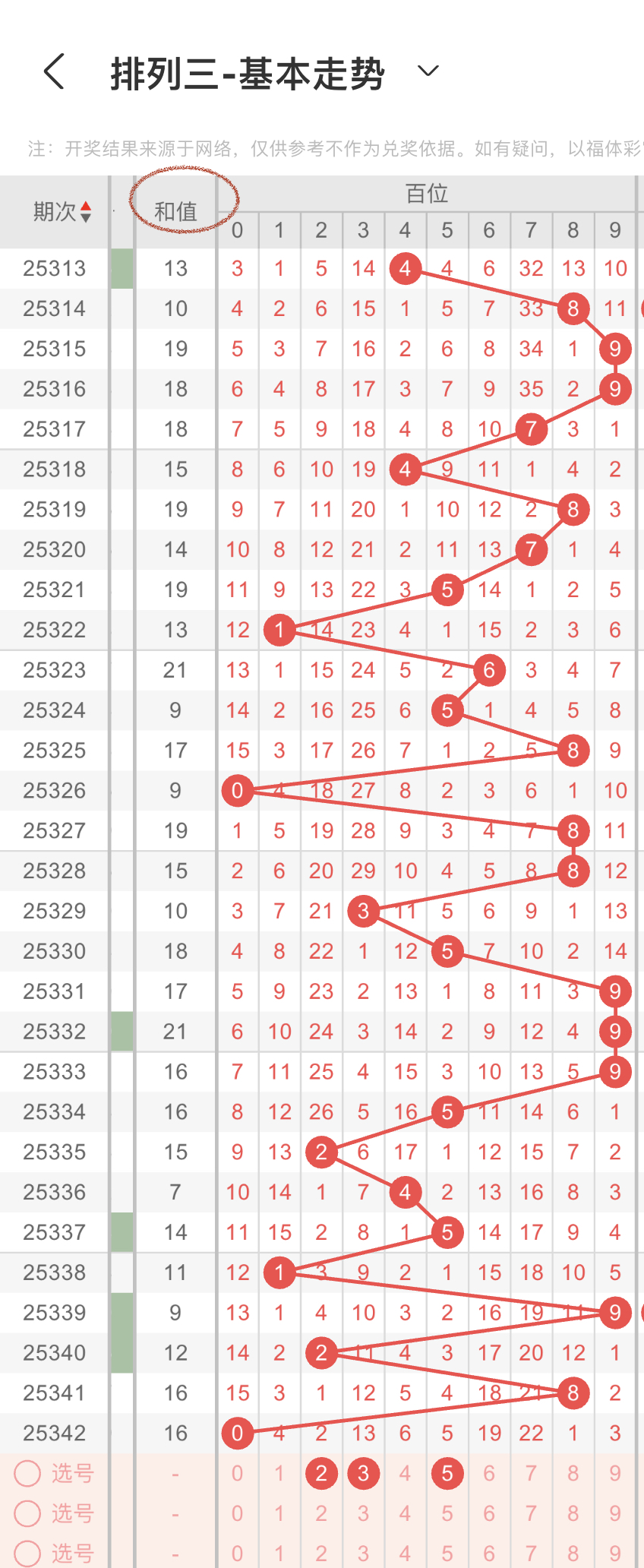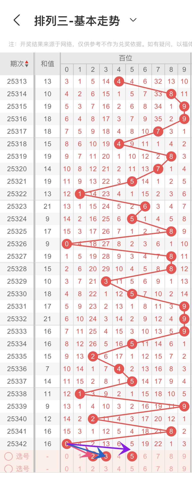 结合上面的大小、奇偶以及012路比,我们可以得到的数据分别是第一组56789,第二组13579,第三组258,我们重点选择3组数据中重复的,那百位我们选择5,防2路的2,0路的3,综上所述百位选235