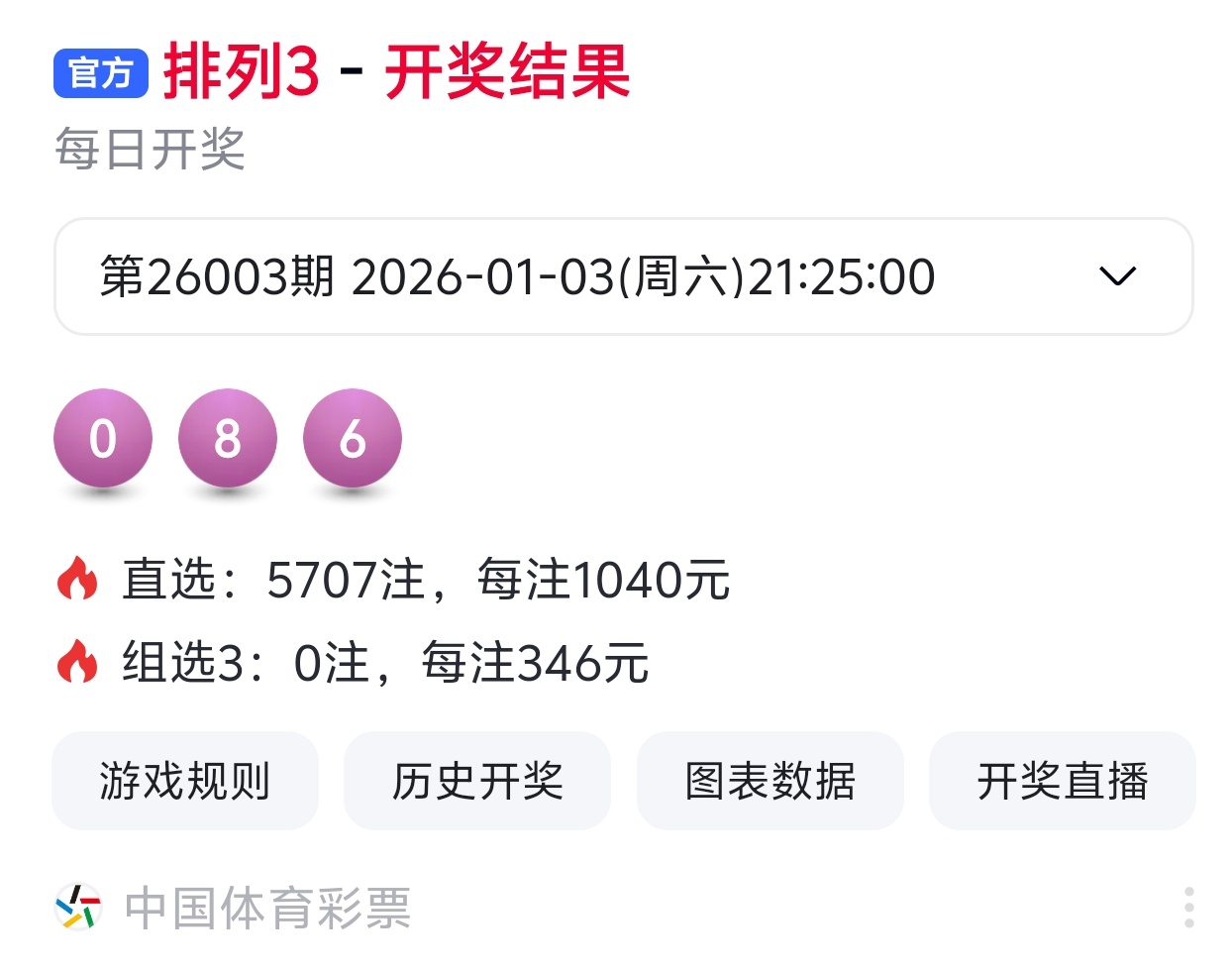 上期开奖号码:086,和值:14,跨度:8,奇偶比:0:3,大小比:2:1,012路比:2:0:1,形态:组六,本期势必拿下,希望能给大家一个靠谱的参考,在大家阅读文章的时候,期望您能动动发财的小手,点点关注,万分感谢,另外也需要提醒大家参考为主,切勿当真,不要盲目跟随!