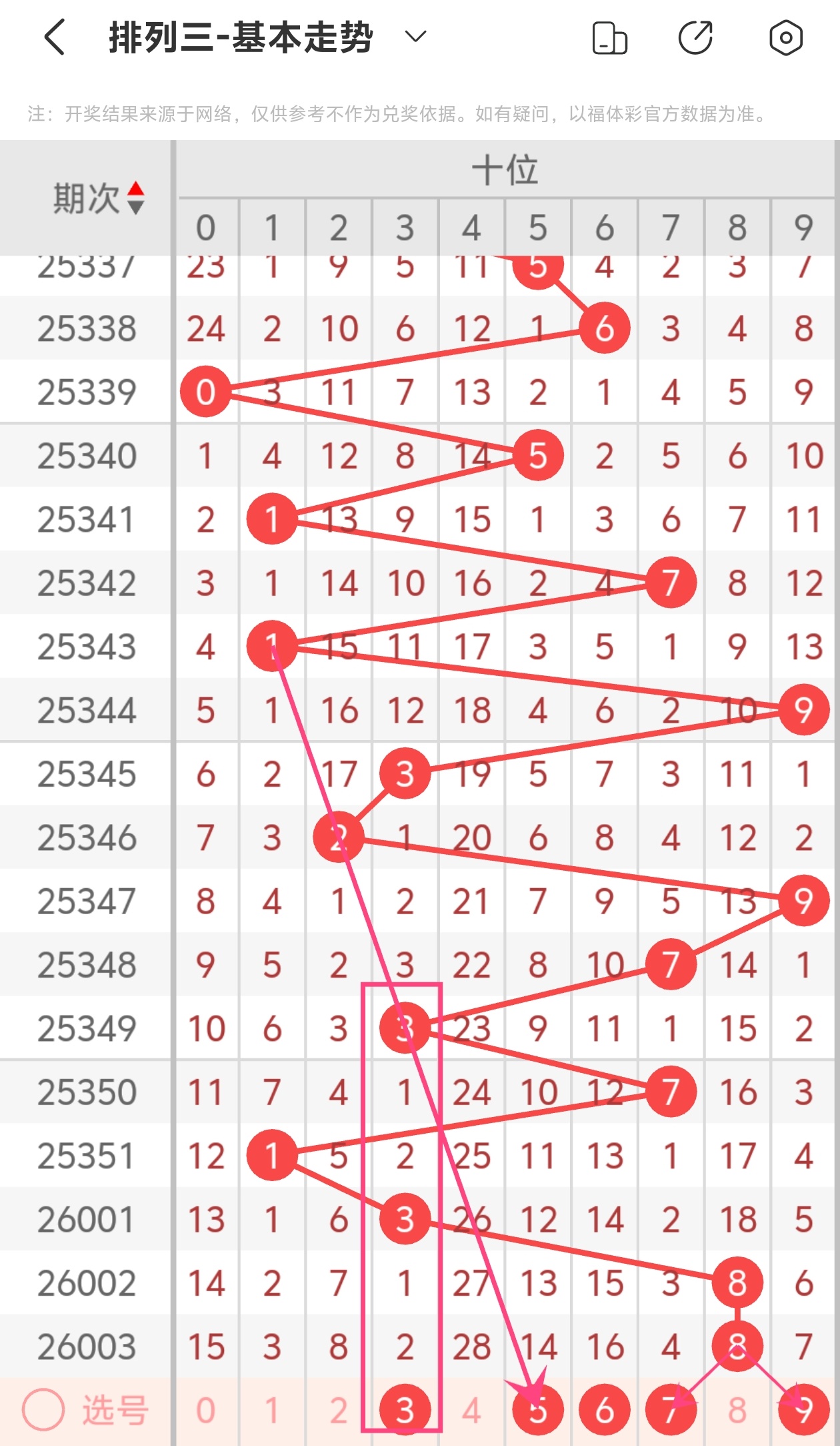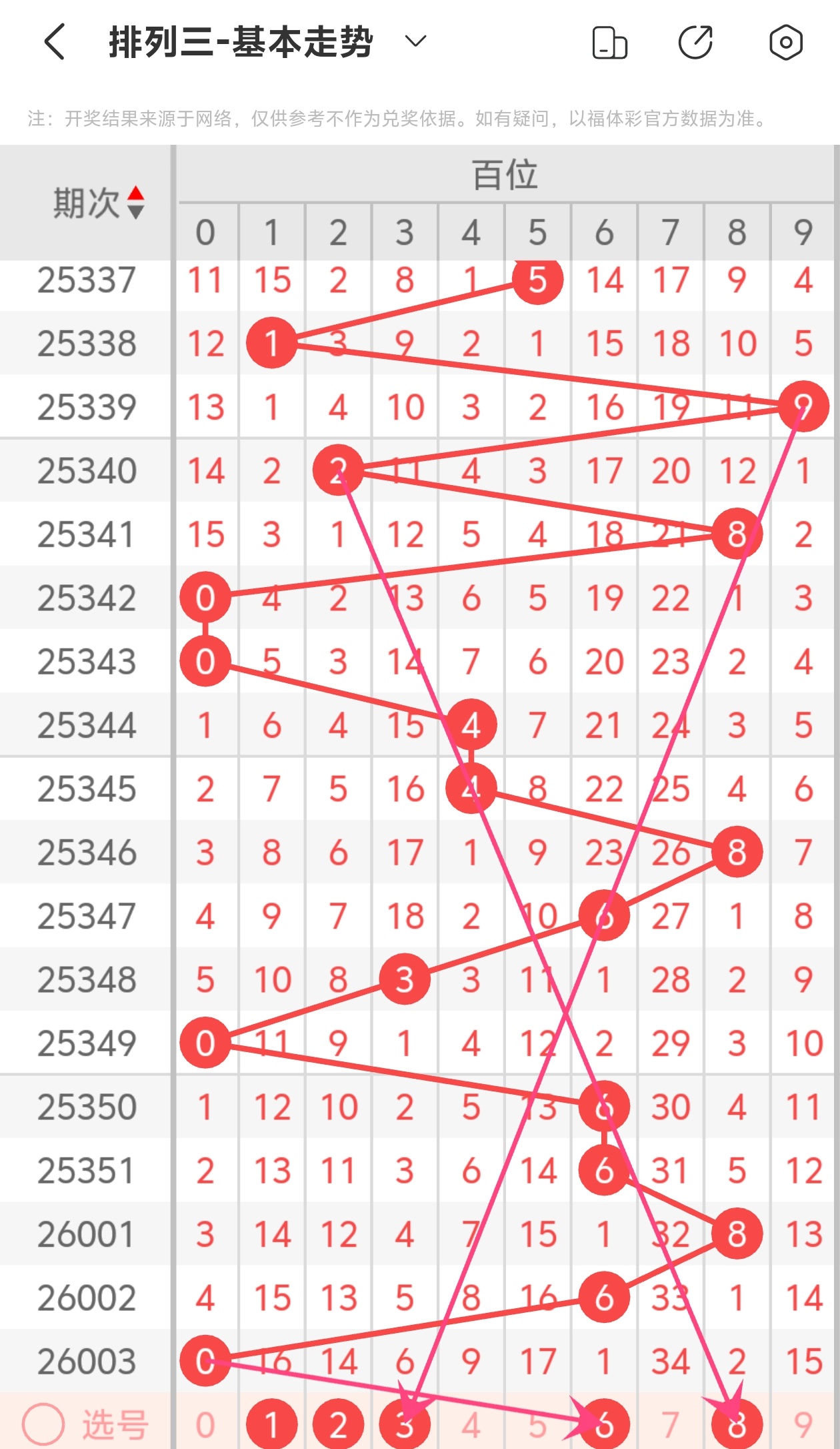 上期百位开出0,本区与上期的跨度为6,本期我们可以从上面走势图中看出选号的思路,3为斜连走势跨度为三,6为隔期回补号,8为斜连走势跨度为八,综合以上分析,本期百位推荐:12368