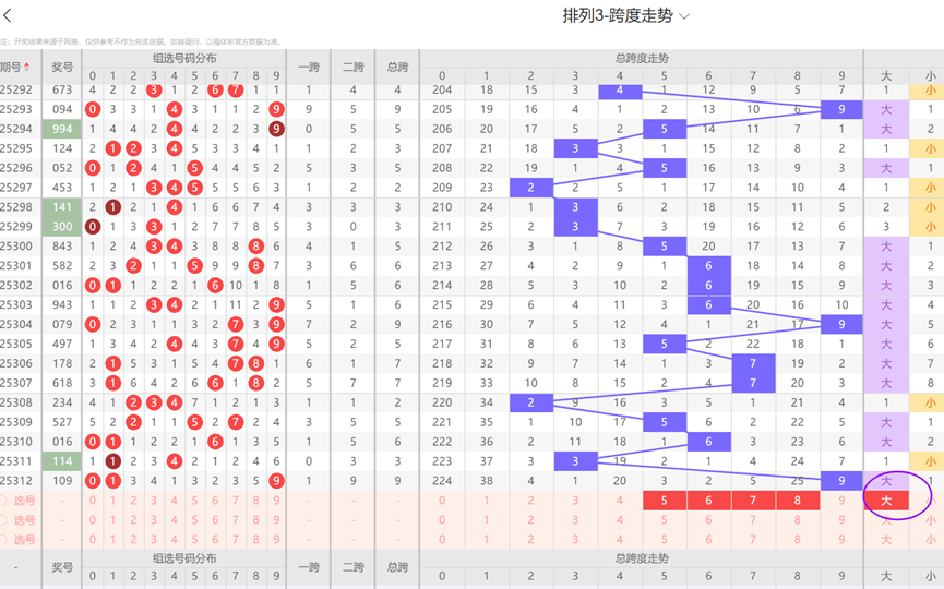 通过观察跨度及跨度属性走势可以发现:近10期内跨度较少开出01等号码,本期跨度开出01等号码的可能性小,因此本期跨度选号时应该优先排除01等号码,再结合上述走势图看,本期跨度看好5678等号码。