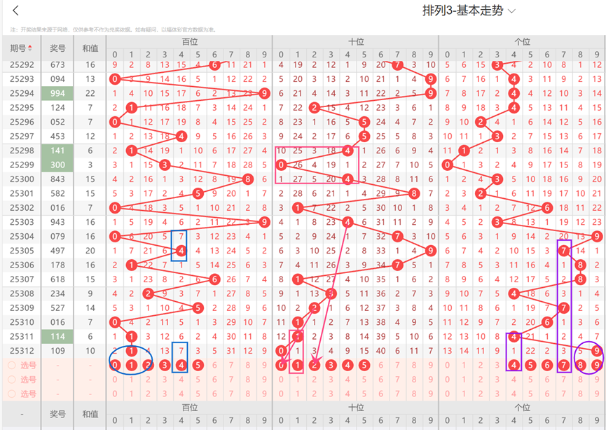 上一期百位开出号码为1,为奇数、小数、质数、1路号码:近10期百位78等号码较少出号,本期百位开出78等号码的机会低,因此本期百位选号时可以优先排除78等号码,结合上述走势图看,本期百位看好012345等号码。