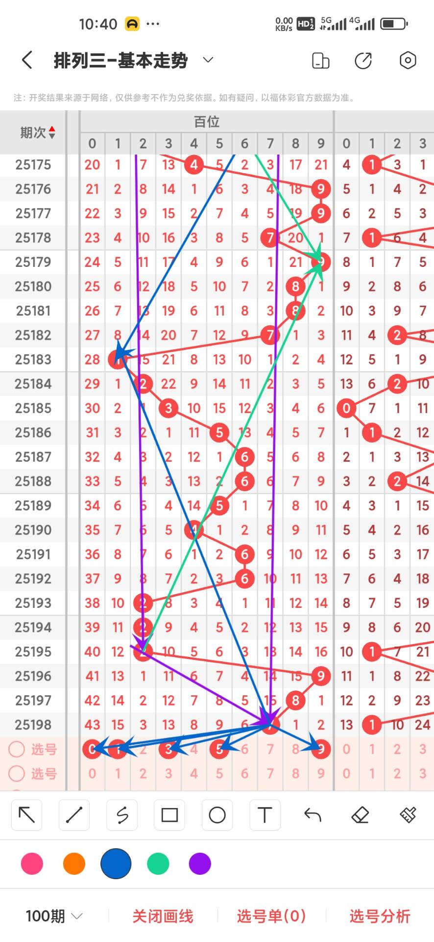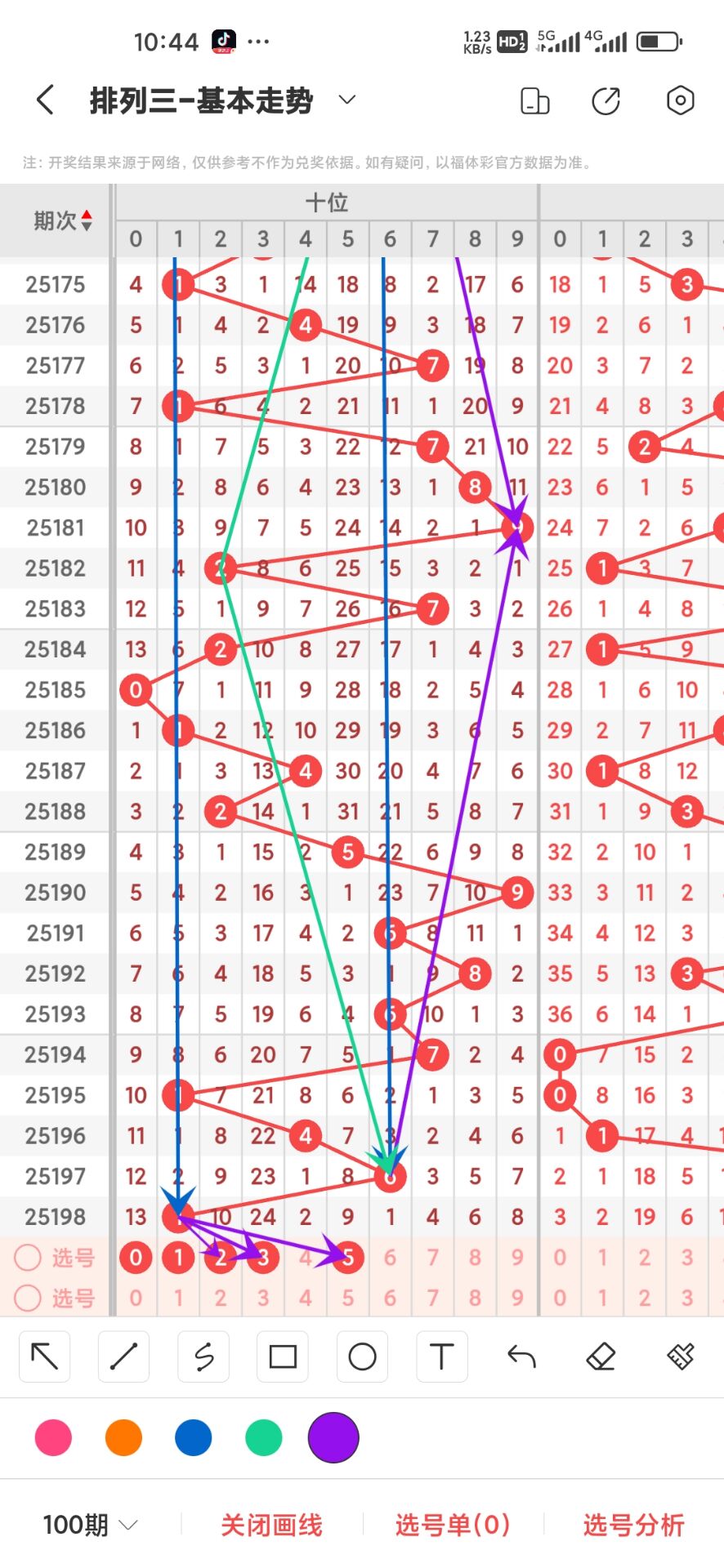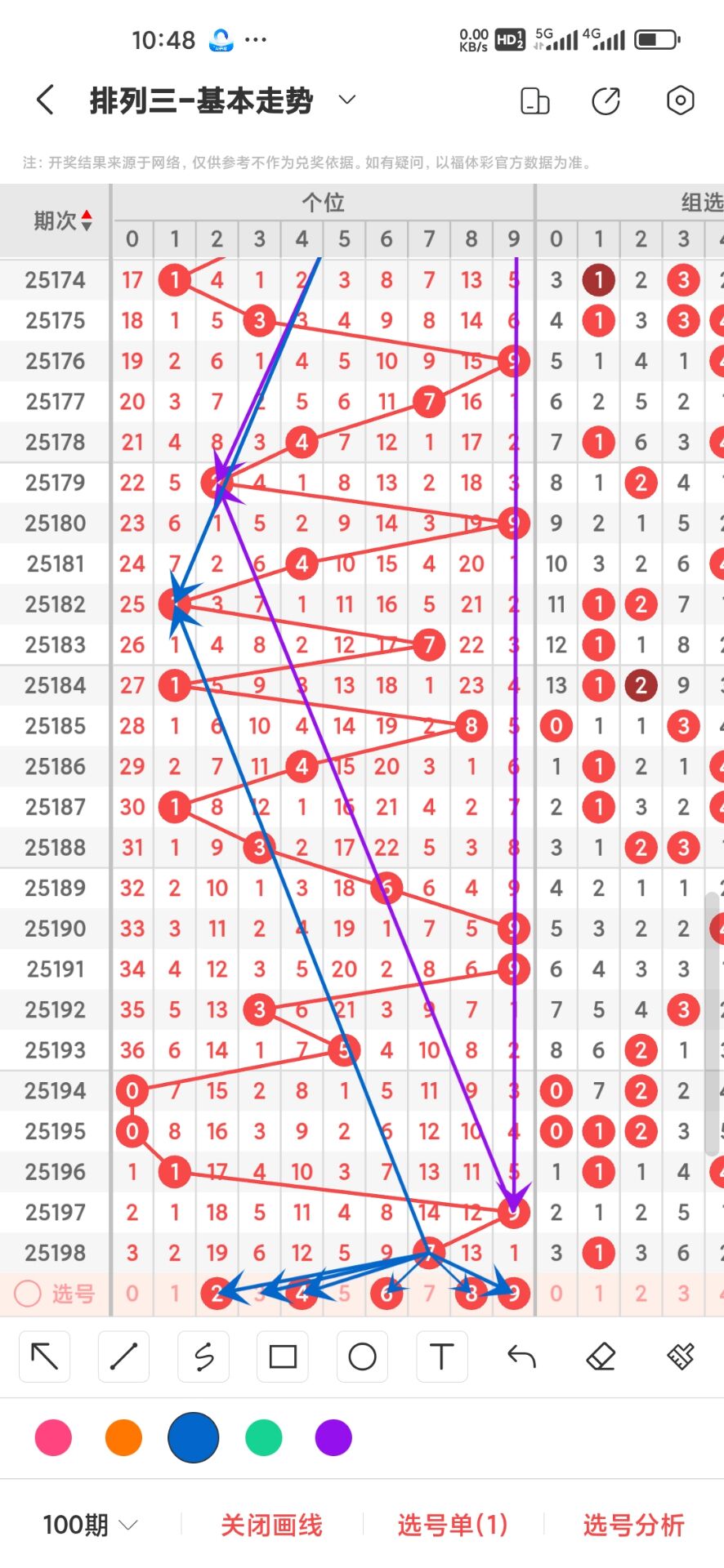 25199期,上期个位开出奇数7,我们从100期走势图来看012路目前的走势是0路出现41次,1路出现37次,2路出现22次,01路差别不大,2路号形态下降,在从奇偶比来看目前奇数出现55次,偶数出现45次,这两者之间奇数形态良好上升趋势,在看大小比方面大号出现40次,小号出现60次,可以看出小号的形态趋势比较高,在看走势图中目前248处于冷号阶段,013789在平稳状态,重点关注小号热号,防冷号大号回补具体看下面走势图