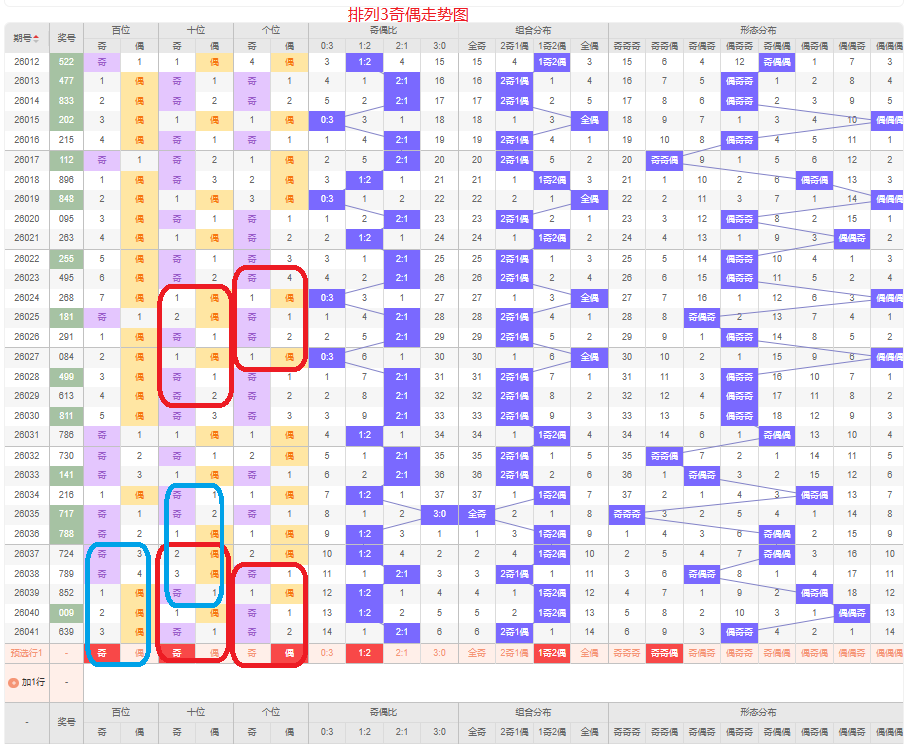 上一期的奇偶比为2:1,两奇的号码组合,从近五期的奇偶数出现情况看,奇数出7次,偶数出现8次,奇数偶数号码出现较平均,本期要侧重两奇的号码组合,侧重奇奇偶或偶奇偶的号码组合,根据奇偶组合形态可做五码定位13579/13579/02468或02468/13579/02468
