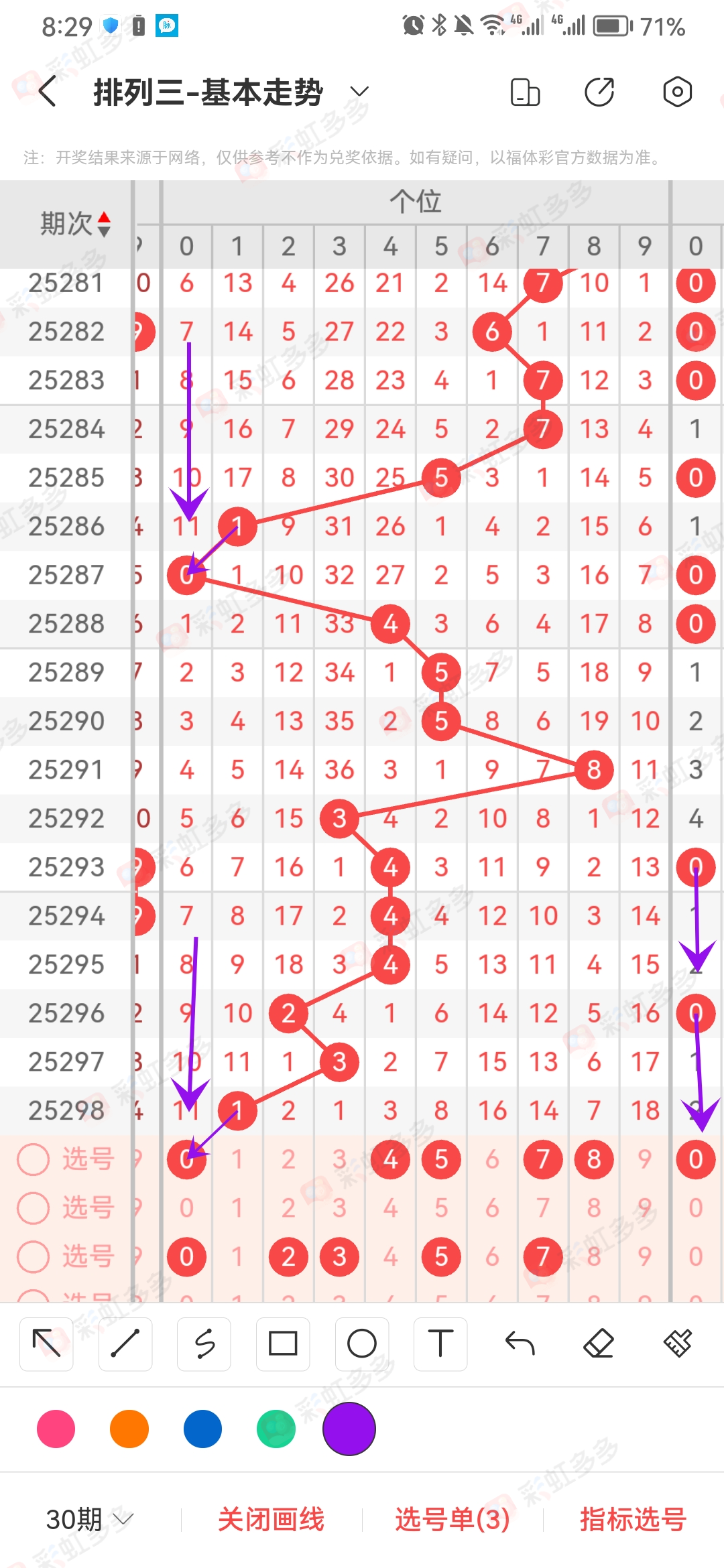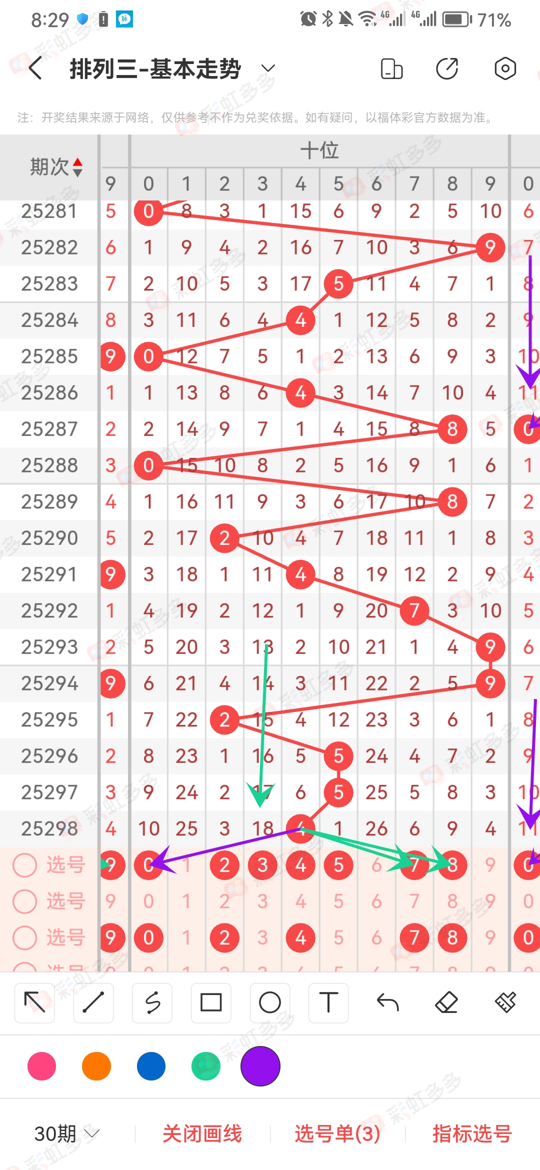 上期十位开出4号球,号(01234),本期看好01234号球,4号球十位开过前后关系出现过有078号球,大号看好78号球,小号看好0号球234。接下来分析十位奇偶走位,根据前面的走位数据分析,本期看好数,防综上分析,十位关注70248的走位!