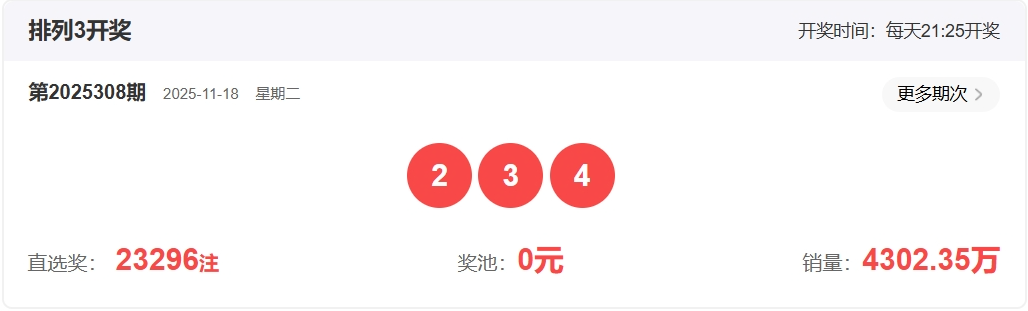 排列三第2025308期开奖回顾:开奖号码:234   形态:组六