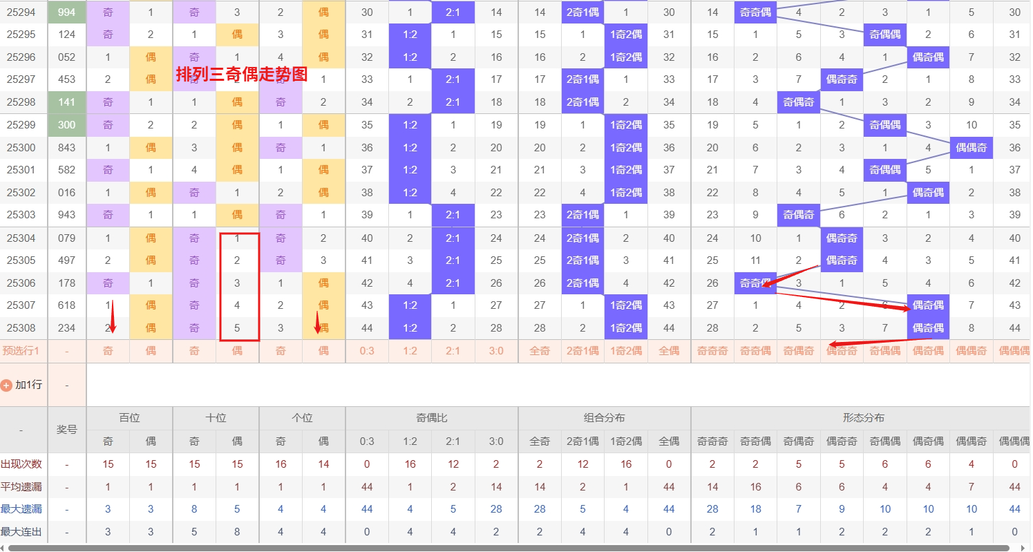 排列三 奇偶分析:从上图可以看出排列三100期内百位奇偶比约为49比51,十位奇偶比为47比53,个位奇偶比为46比54,百位的比值比较均衡,但是个位的比值偏差就有点大,历史奇偶形态近2期开出偶奇偶后下一期的走势为,第236期开出偶奇偶后237期开奇偶奇, 第247期开出偶奇偶后第248期开偶偶奇,第251期开出偶奇偶后第252期开奇奇奇,排列三近期奇偶走势分析,“奇偶奇”与“偶偶奇”组合呈现出明显的热态。这两种组合在概率均衡的长期背景下,其短期的强势表现往往具备一定的惯性,需高度警惕它们再次“连下”,即连续开出的可能性。采取“顺势而为”的思路,对这两种热号组合进行重点防守,同时也要注意,任何热态都必然伴随回调的压力,在追踪热点的过程中也应保持对其它组合冷不防回补的警惕,所以排列三2025309期奇偶形态推奇偶奇与偶偶奇。