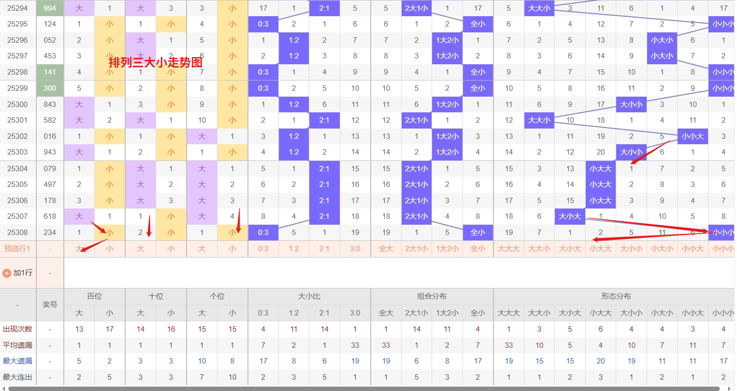 排列三 大小形态分析:从大小走势图上可以看出排列三100期内百位大小比约为47比53,十位大小比约为45:55,个位大小比约为51比49,除了个位奇数比偶数多,十位和百位是偶数比奇数多。历史数据近2期开出小小小下一期的走势为,第232期开出小小小第233期开大大大。第244期开出小小小后第245期开小小大,第255期开出小小小后256期开大大小。排列三近期大小走势分析,“大大大”组合已长期遗漏,形成了显著的冷态,其理论回补压力正随遗漏周期延长而不断累积,值得后续重点跟踪。与此同时,“大大小”组合近期表现趋于活跃,已从温号区间明确展现出转热迹象,这种势头往往具备惯性,需重点防范其热度确认后连续开出的可能。采取“盯冷防热”的均衡思路:既要关注“大大大”组合的冷极反弹信号,也要及时跟进“大大小”组合的转热态势,所以排列三第2025309期大小形态推荐小小大大大大
