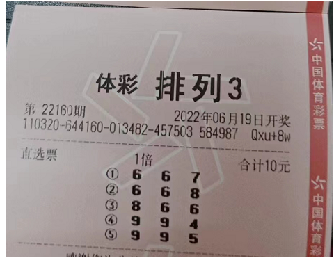 首先看到第一张彩票,大家可以看到这张票有一个很明显的现象就是组选3模式,并且都是用66、99对子号码,为什么这么选择呢?因为通过近期排三中间数字走势图来看,连续10多期中间数字没有开出0路号码,因此选择0路号码为中间数,如果那66和99对开出,那么中间数字就是6和9了,符合中间数字理论。