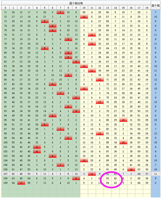 上图很清晰的看到了近期排三百个和有一个指标,是特别值得关注的,那就是百个和等于13和14指标,两者同冷来到了43期,近期是一定要开出的,但是具体哪天开出,并不知道,所以上面彩票中这些号码是完全有可能中出的,它们都符合百个和两两相加等于13和14不得不防。
