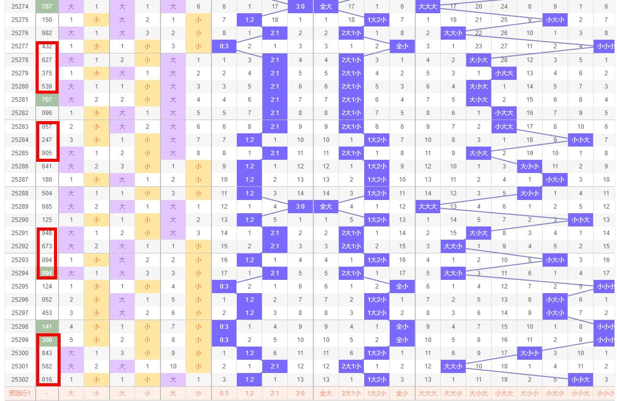 大小走势分析: 在排列3的大小走势中,近期数据显示大小组合分布较为均衡,但细致观察历史数据,发现大小组合呈现出一定的周期性变化。对于第303期预测大小比例可能为1:2或2:1。考虑到近期小号略有增多,建议重点关注大小比例为2:1的组合,即两个大号搭配一个小号。近十期大小比为9:21小数占据优势