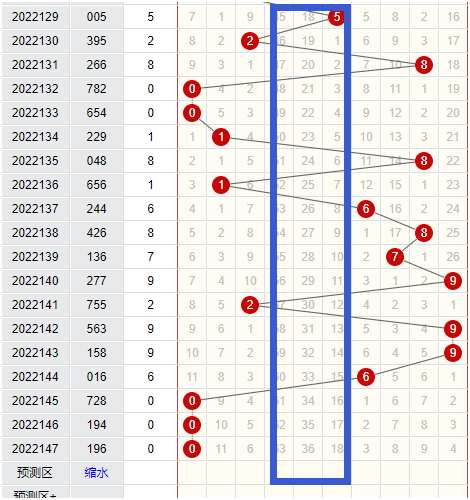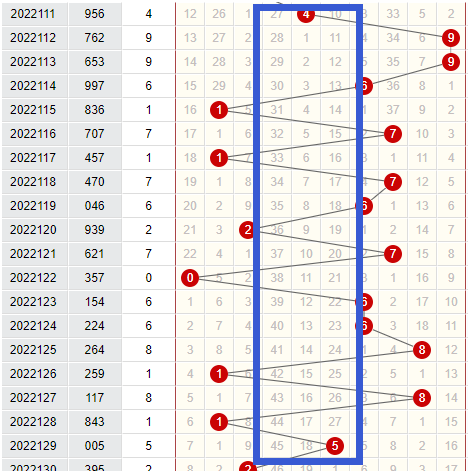 上图就是近期排三里从111期到130期最大数最小数字合我们可以看到图中最大数最小数字合为3、4、5的号码组合,是一组同冷他们同冷期数是27期,一直到129期开出奖号是005,它的最大最小数字合为5,才打破了这个怪异的状态,那么这最大数最小数字合为3、4、5是不是在130期之后应该走热了,这么长时间没有开?