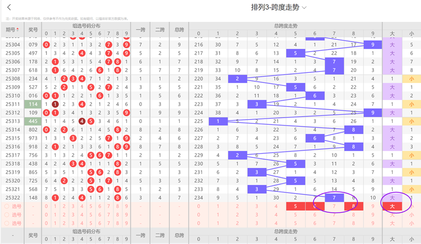 通过观察跨度及跨度属性走势可以发现:近10期内跨度大数号码出号后,下期容易连开大数号码,上期跨度开出了大数号码7,本期跨度大数号码出号可能性高于小数号码,因此本期跨度选号时应该继续考虑大数号码,再结合上述走势图看,本期跨度看好568等号码。