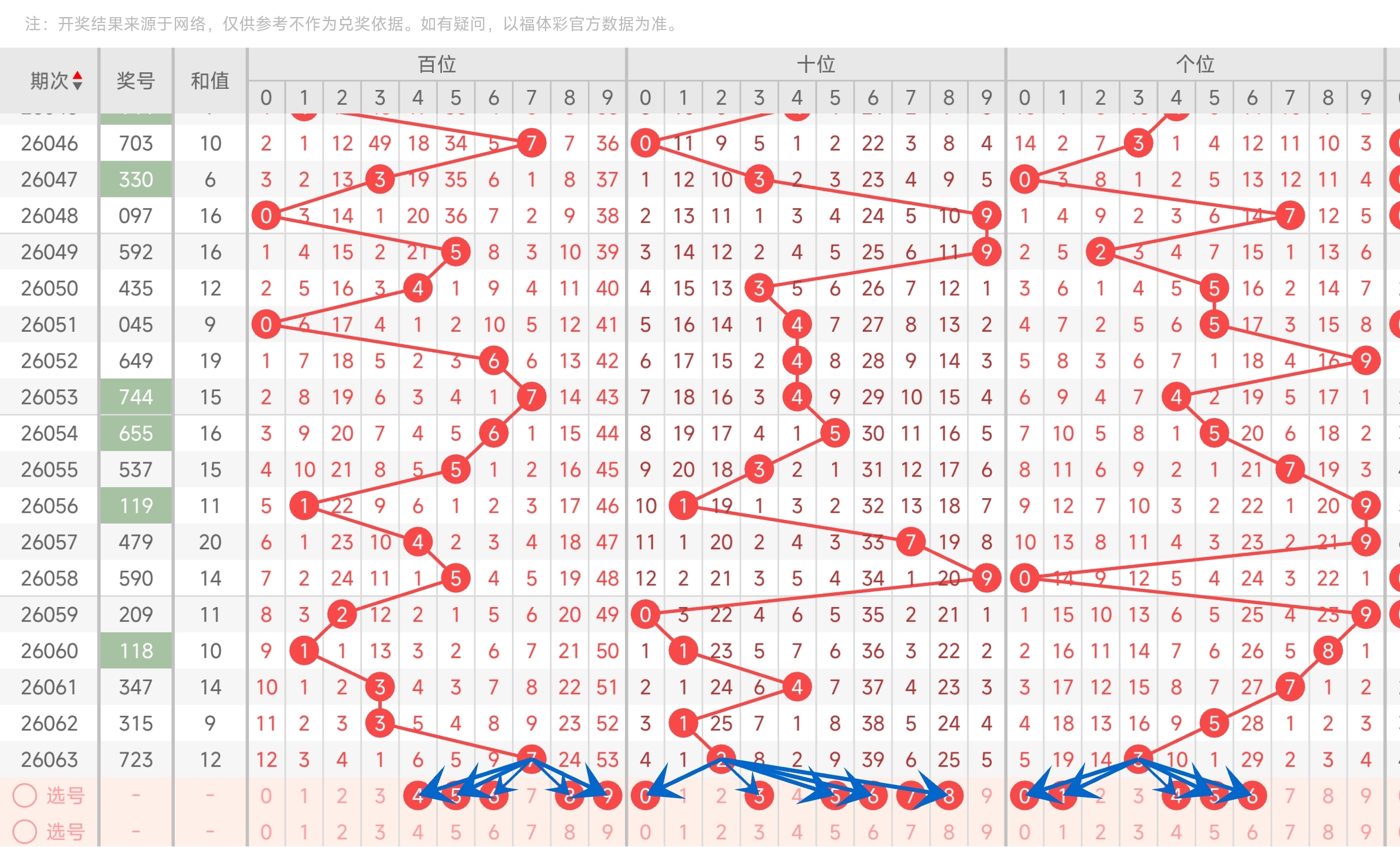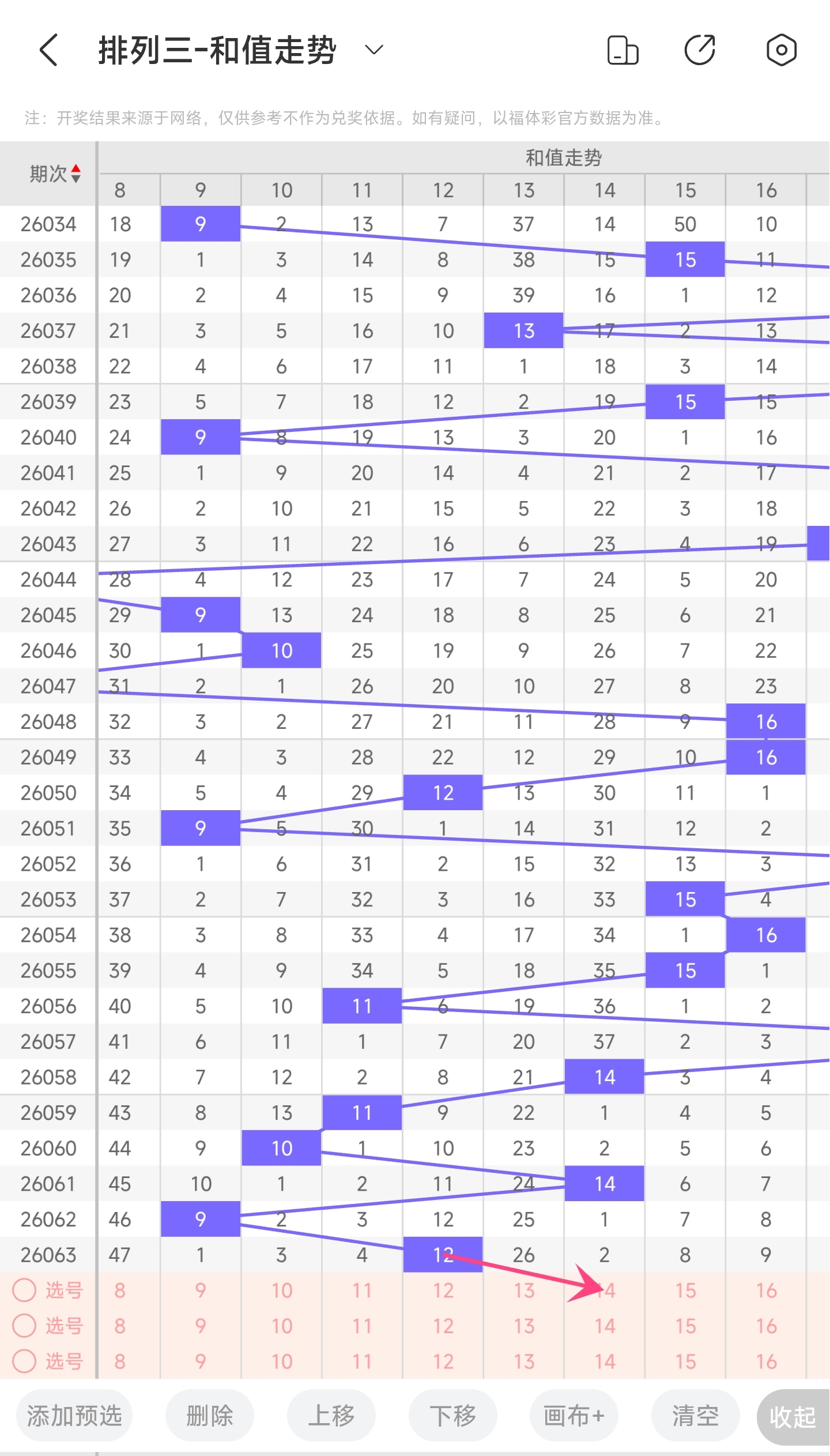 上期和值为12,往前一期和值为9,趋势往右移动,偏移量为3。通过走势图分析,12和值是近30期内开出比较小的和值,下降空间比较小,上升空间比较大,推测本期和值可能变大。所以本期趋势是可能往右的,和值会变大,小概率往左,和值变小。