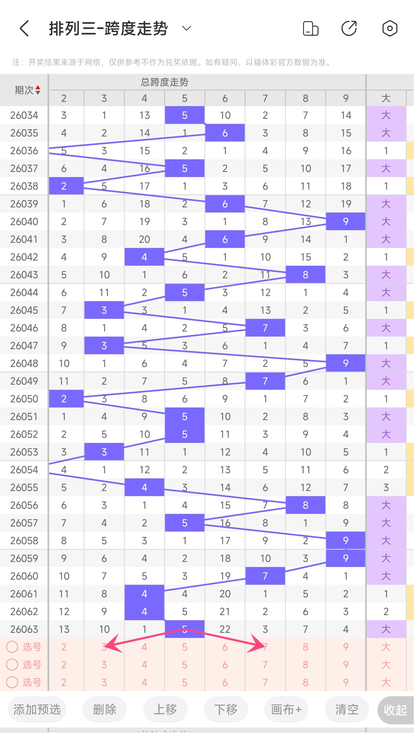 上期跨度为5,往前一期跨度是4,趋势往右移动,偏移量为1。跨度值5时,跨度值是近30期开出中间的值。通过走势图分析,目前的趋势是可能往左也可能往右。所以推测本期跨度可能为23678等跨度。