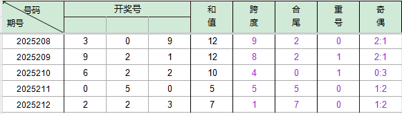 2025208期开奖号码309,我们可以看出近30期百位3出现2次,十位0出现4次,个位9出现4次(较210期减一)。