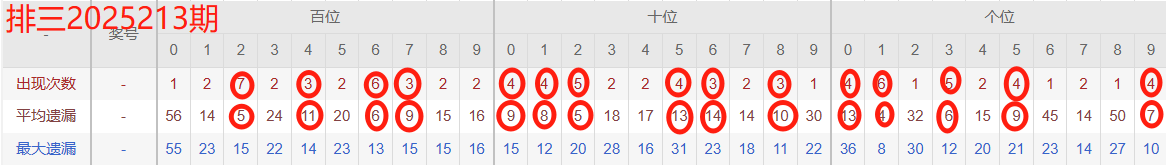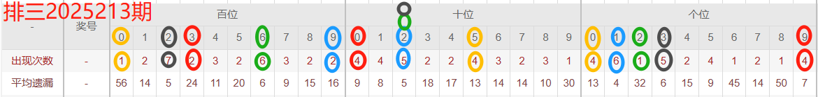 2025212期开奖号码223,我们可以看出近30期百位2出现7次,十位2出现5次,个位3出现5次。