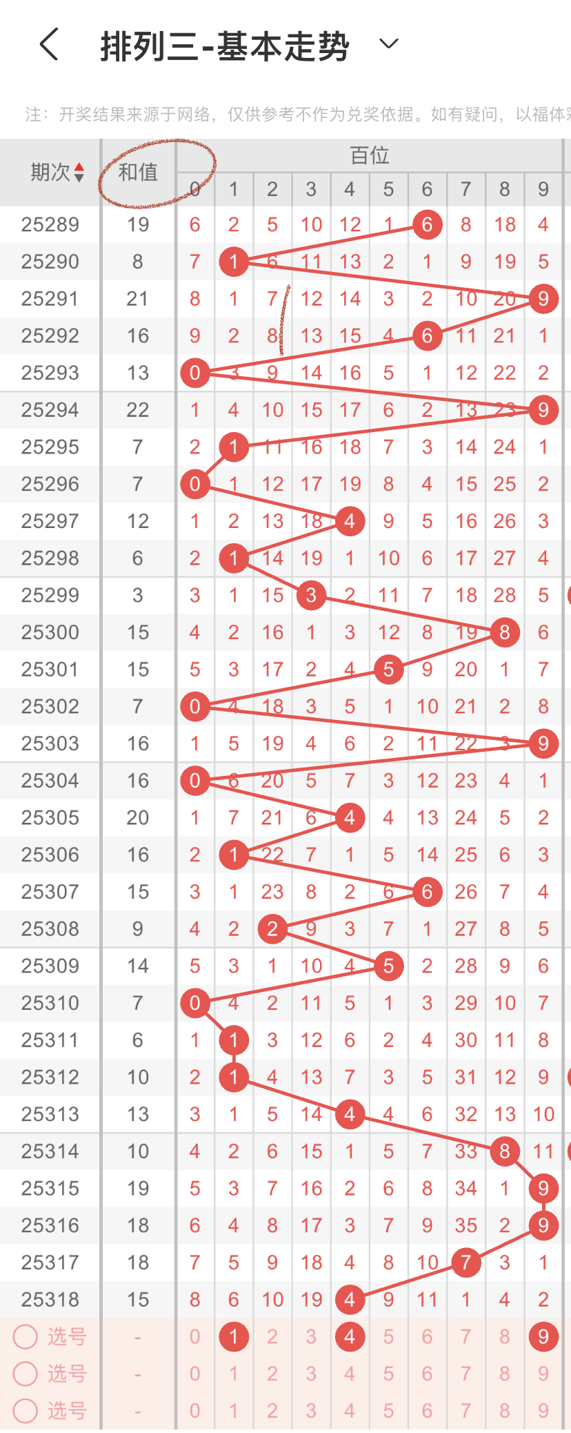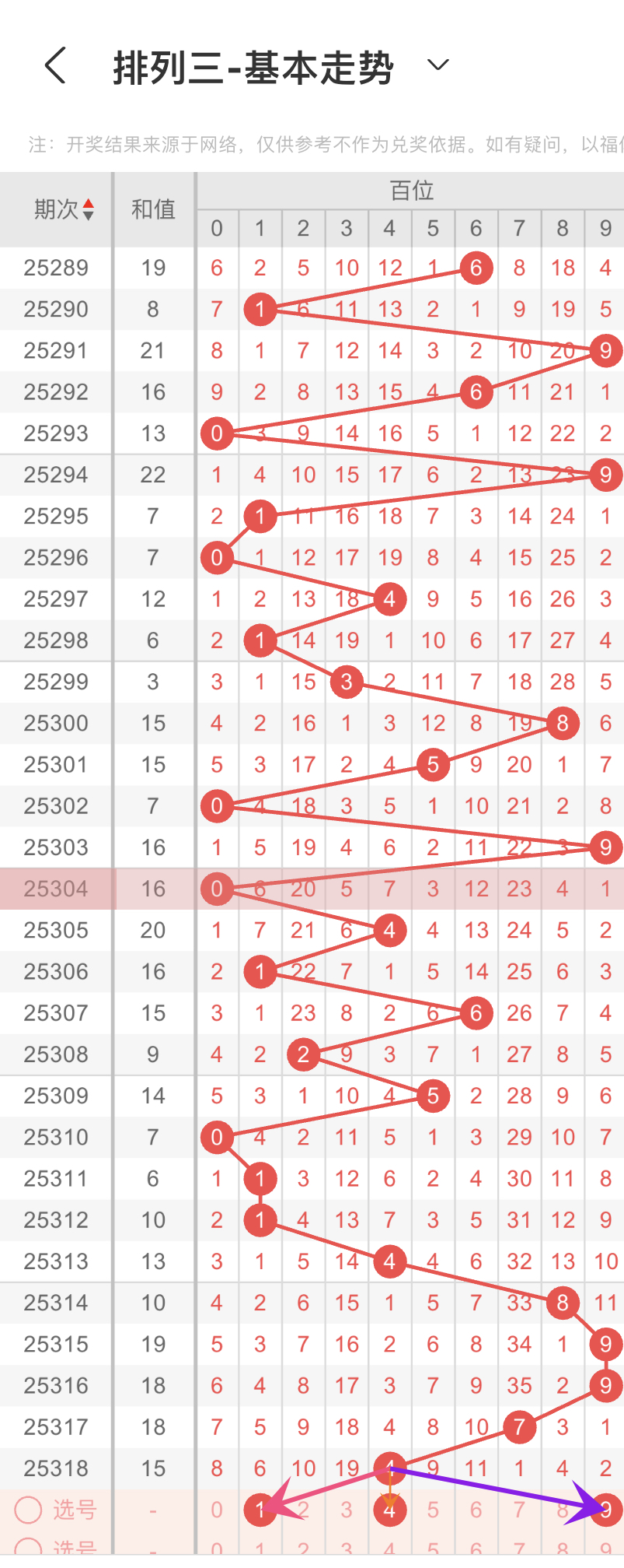 结合上面的大小、奇偶以及012路比,我们可以得到的数据分别是第一组01234,第二组02468,第三组147,我们重点选择3组数据中重复的,那百位我们选择4,防1路的4,0路的9,综上所述百位选149