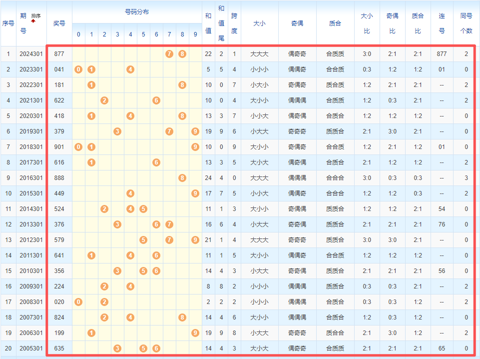 1、统计往年同期开奖号码
