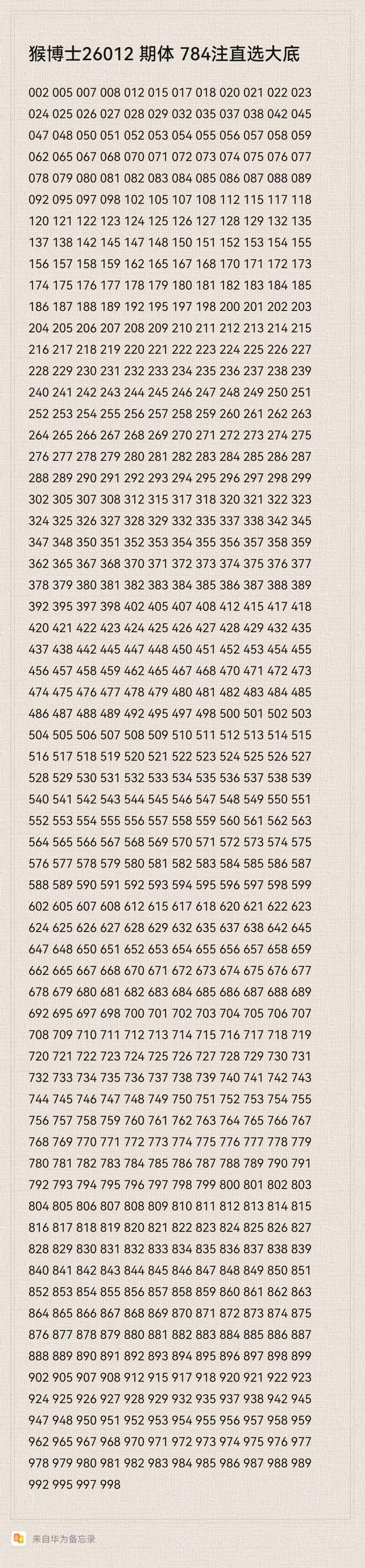 猴博士26012期排列三784注直选大底:(可以当母底用,然后进行缩水)
