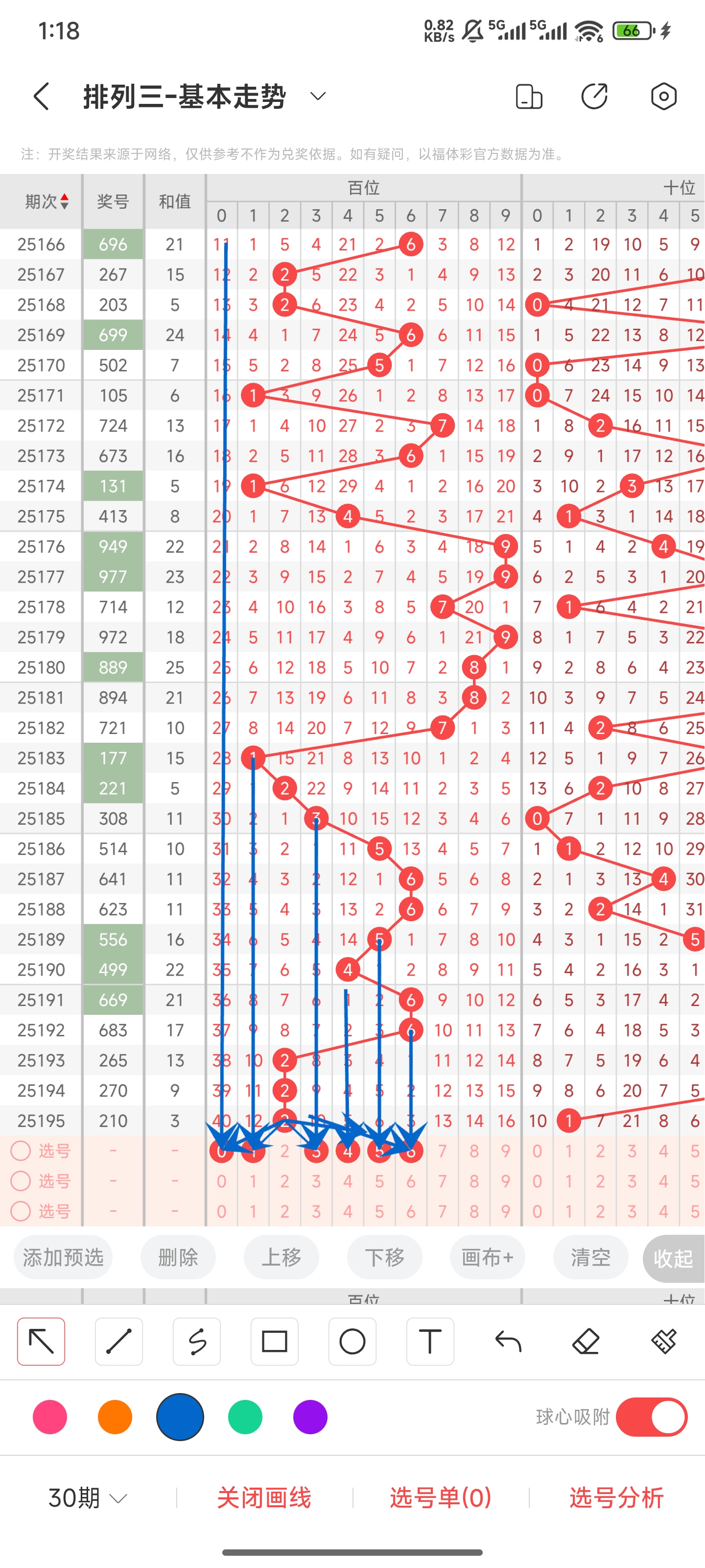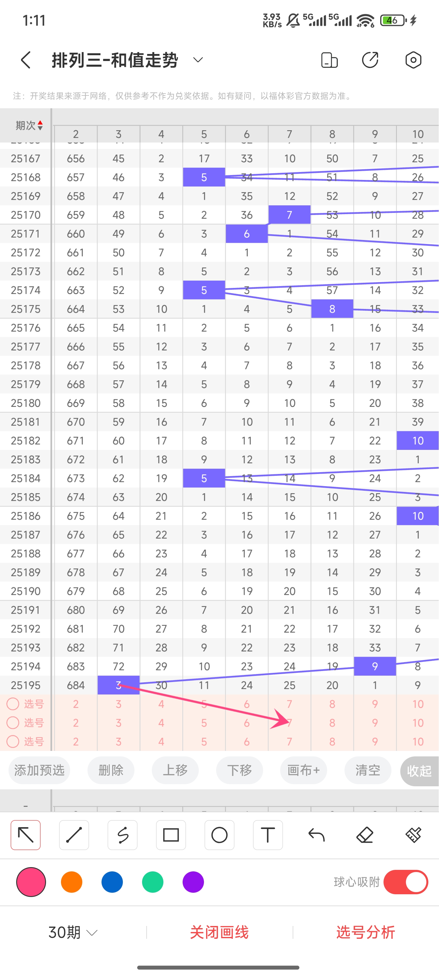 上期和值为3,往前一期和值为9,向左偏移了6个点位。3是目前30期内开过的最小和值了,基本上不会再下降了。结合走势图趋势,本期趋势应该是往右走的了,和值会增大。